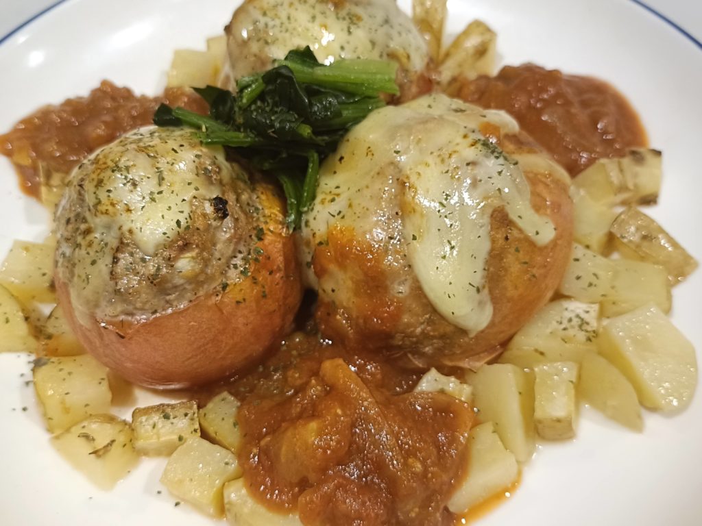 昨日のパーティー特別メニューで作りました。トマトをくり抜きハンバーグを詰めオーブンで焼きました。チーズも乗せて!