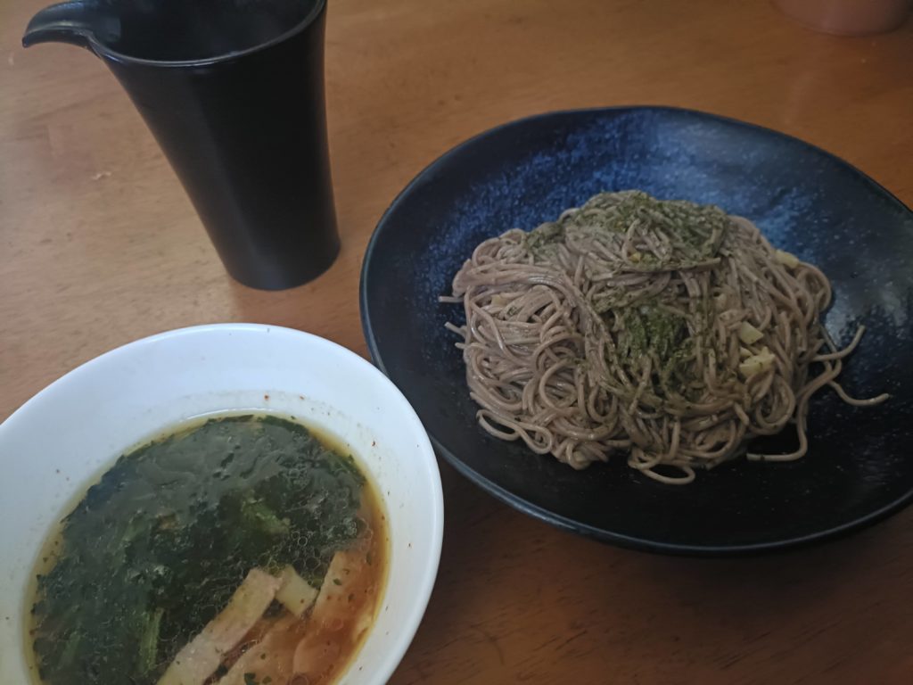 冷たいそばに温かいつけ汁のパターンで!つけ汁はもう少し量があった方が冷めずに良いかも?味は予想通りで良い感じ。ペペロンチーノのオイルに麺つゆを入れた和洋折衷です。