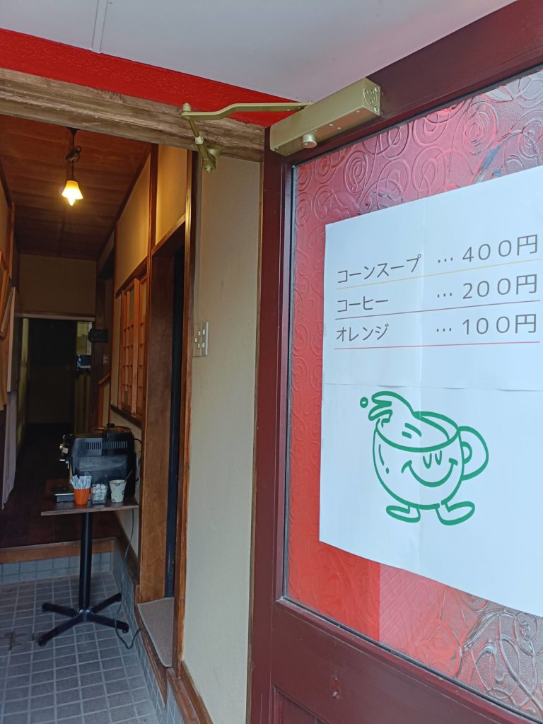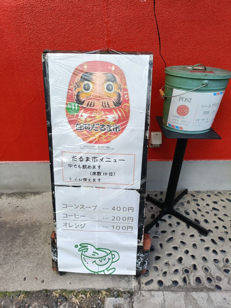 だるま市にコーンスープ、コーヒー、オレンジジュースを用意します。